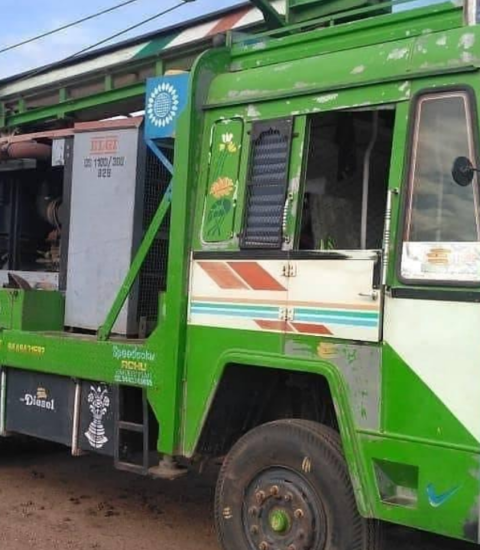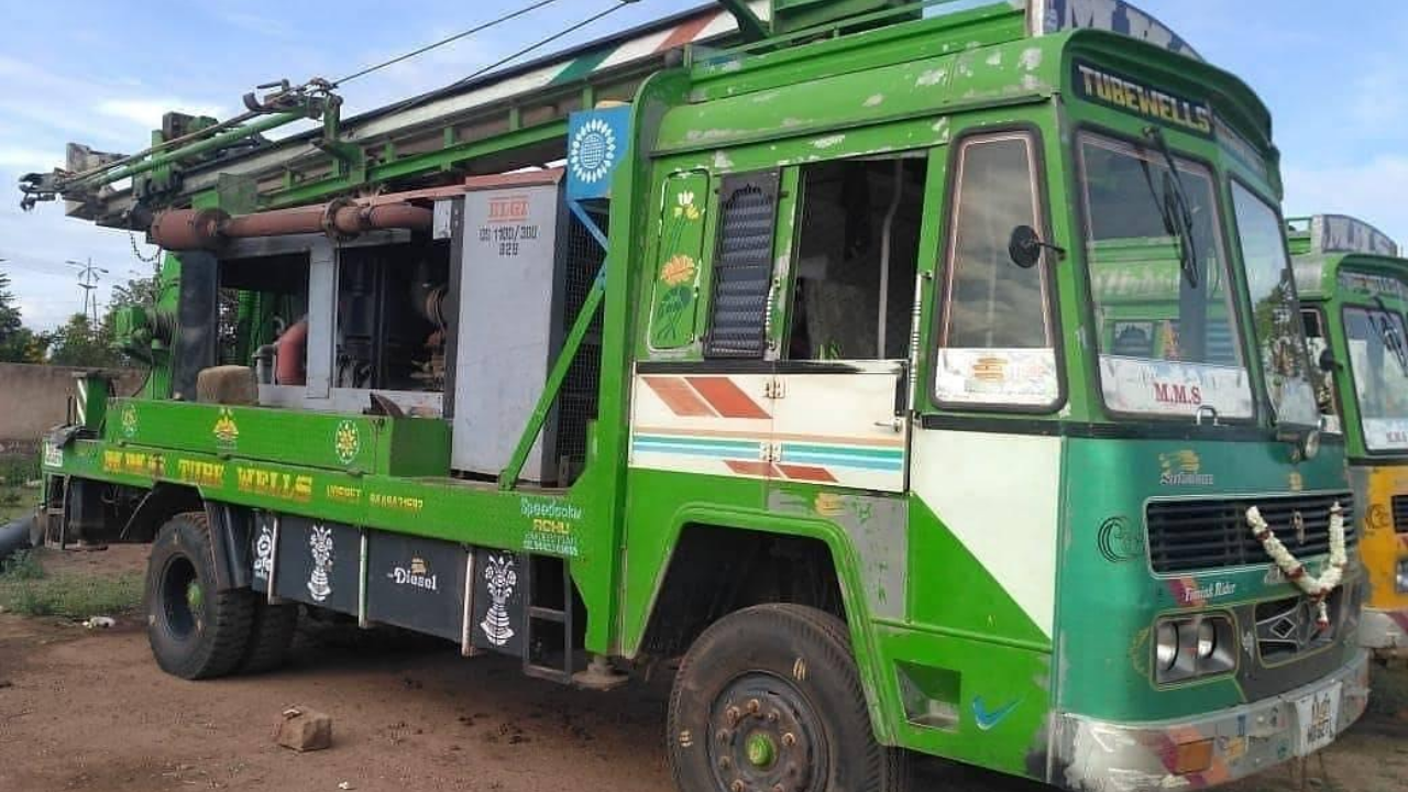 Its fairly used. It’s a reinforced Ashok Leyland 1616 chassis…Equipped with an Elgi 1100/300 air compressor. Drilling depth-300mtrs.